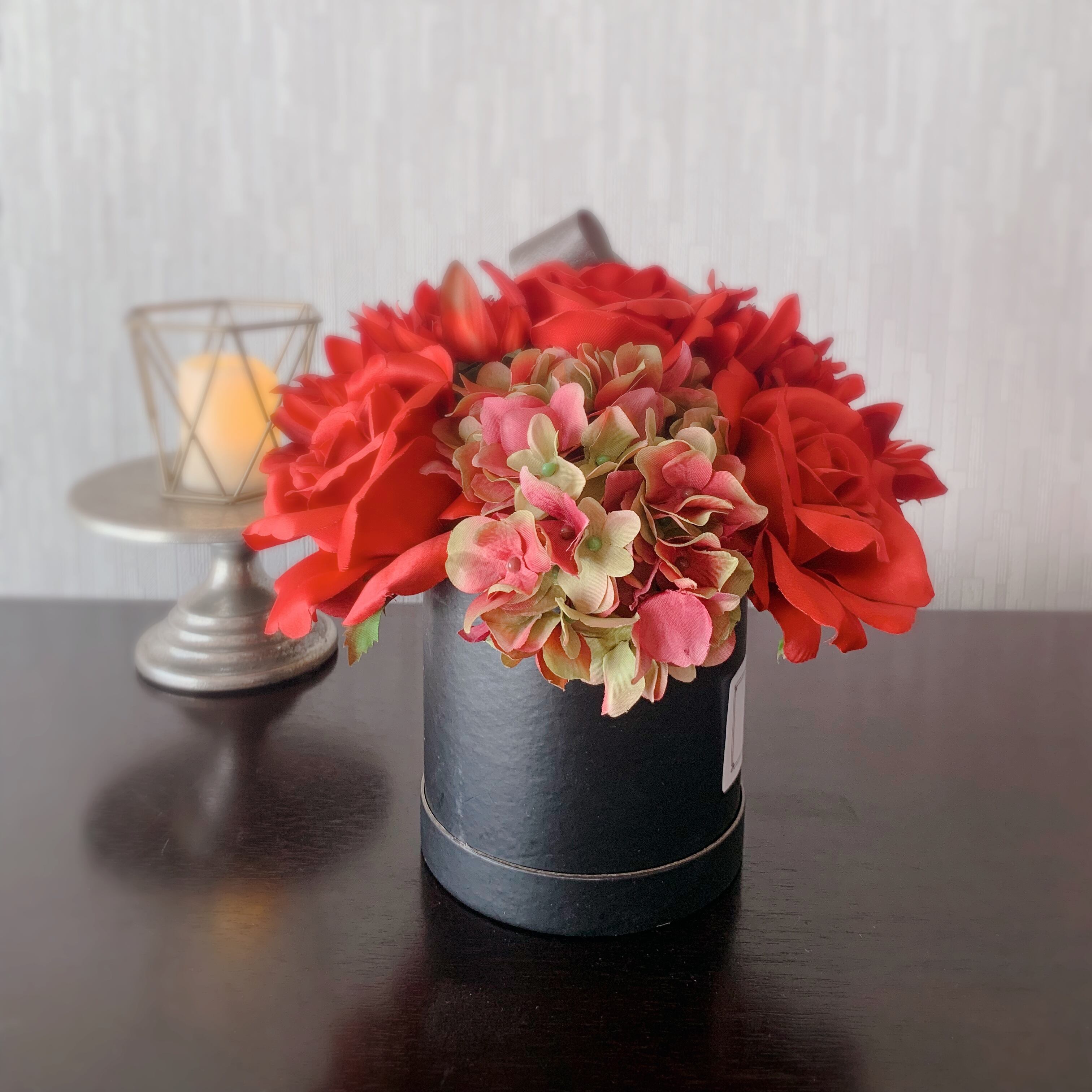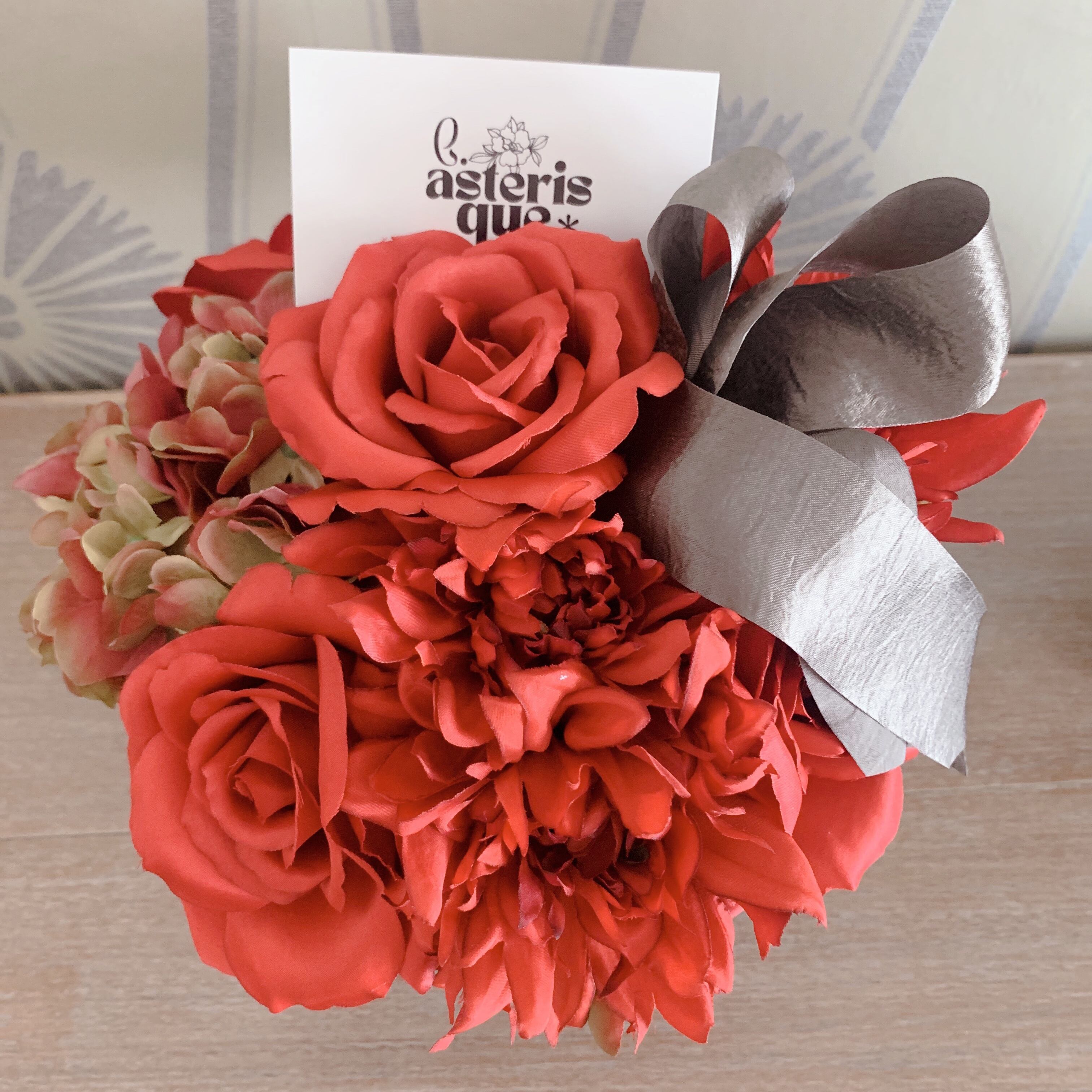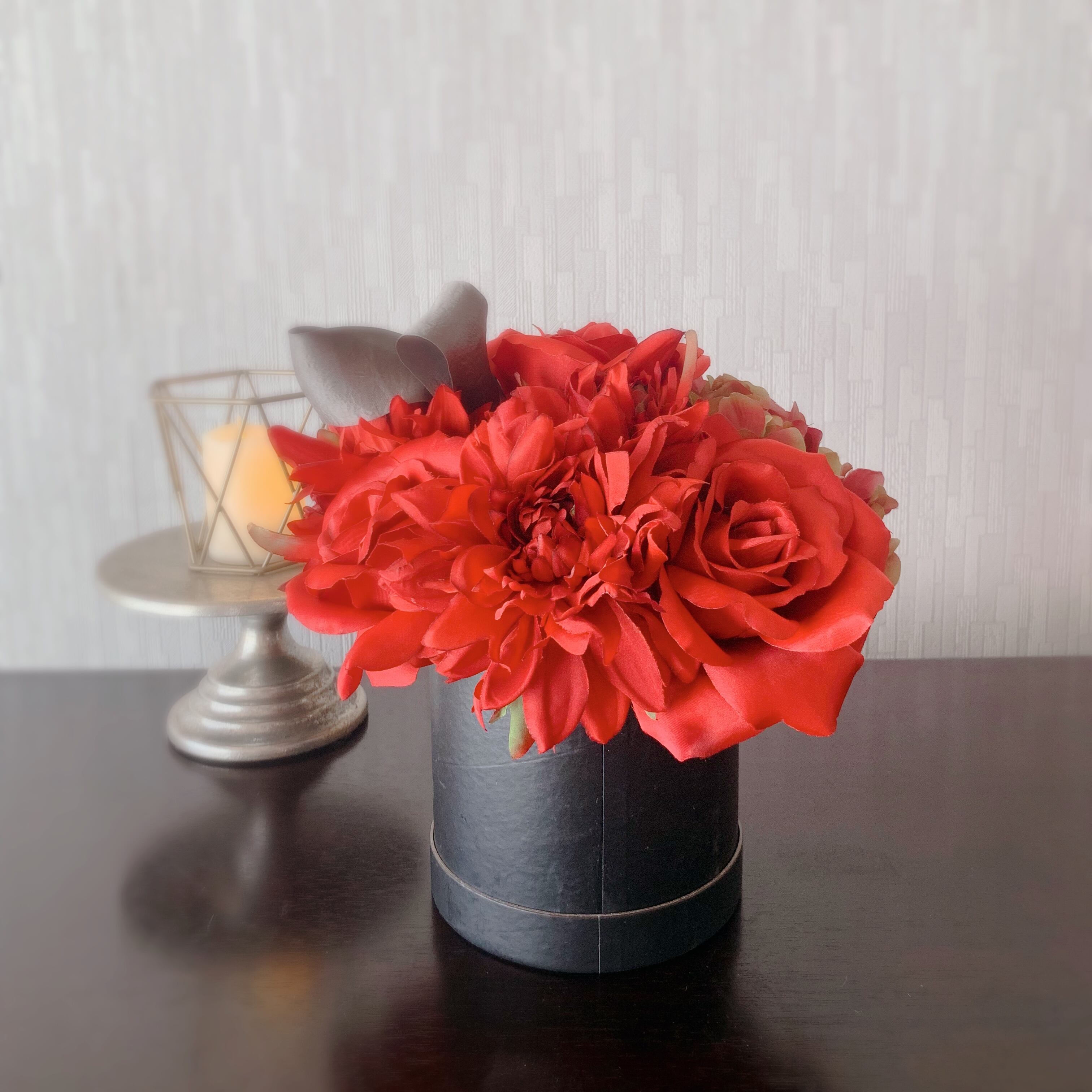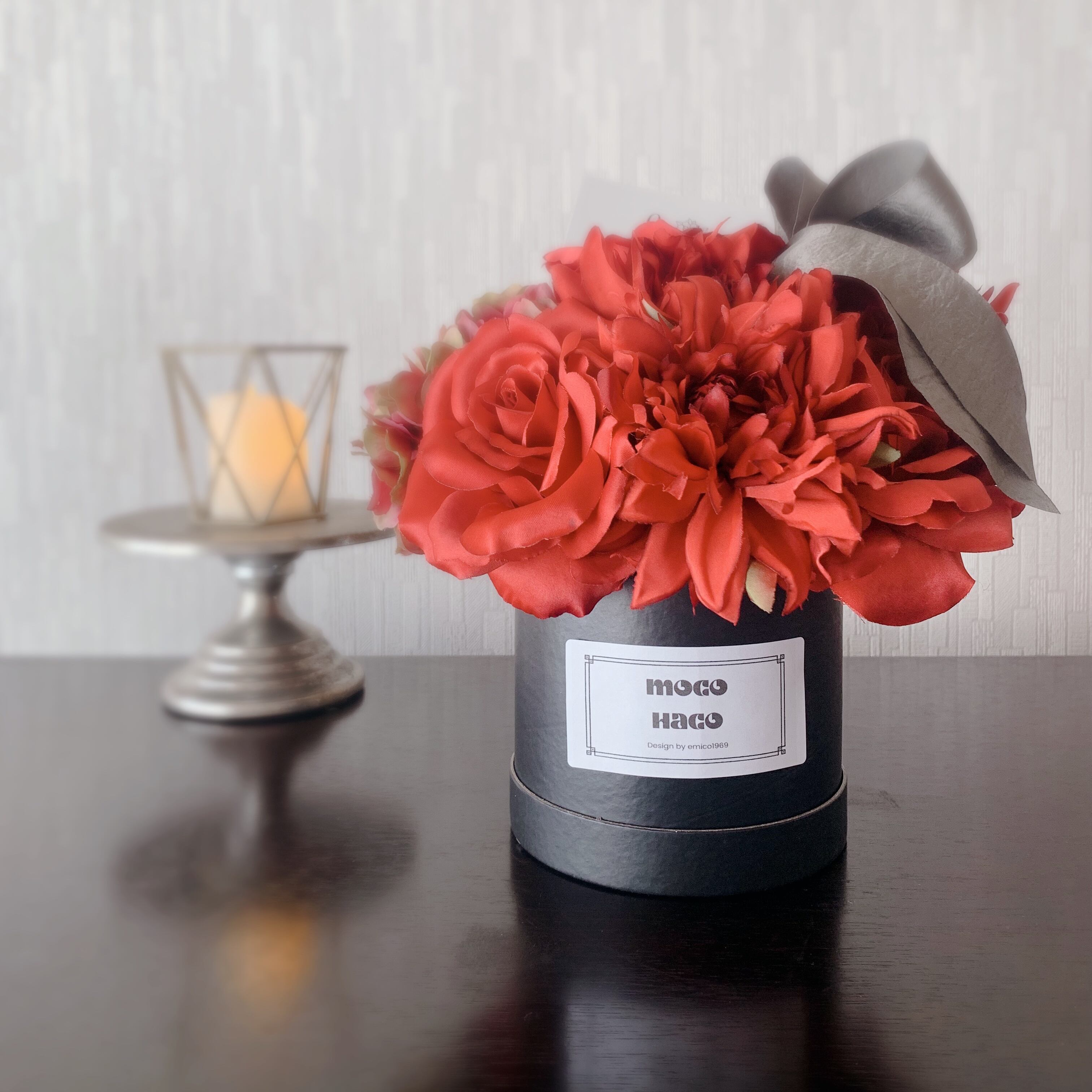 贅沢なボリュームで大人の空間を演出する「moco haco モコハコ」は、造花とは思えないリアルさとシックなデザインが特徴です。自身のスタイルを引き立てるために厳選されたローズ、ダリア、ハイドランジアをフワモコにアレンジし、目を引く存在感を放ちます。深みのある色合いは、リビングやダイニング、オフィスなど、様々なシーンに華やかさとエレガンスをもたらします。まるで生花のような質感と美しさを持ちながら、メンテナンスフリーで忙しいライフスタイルをサポートします。