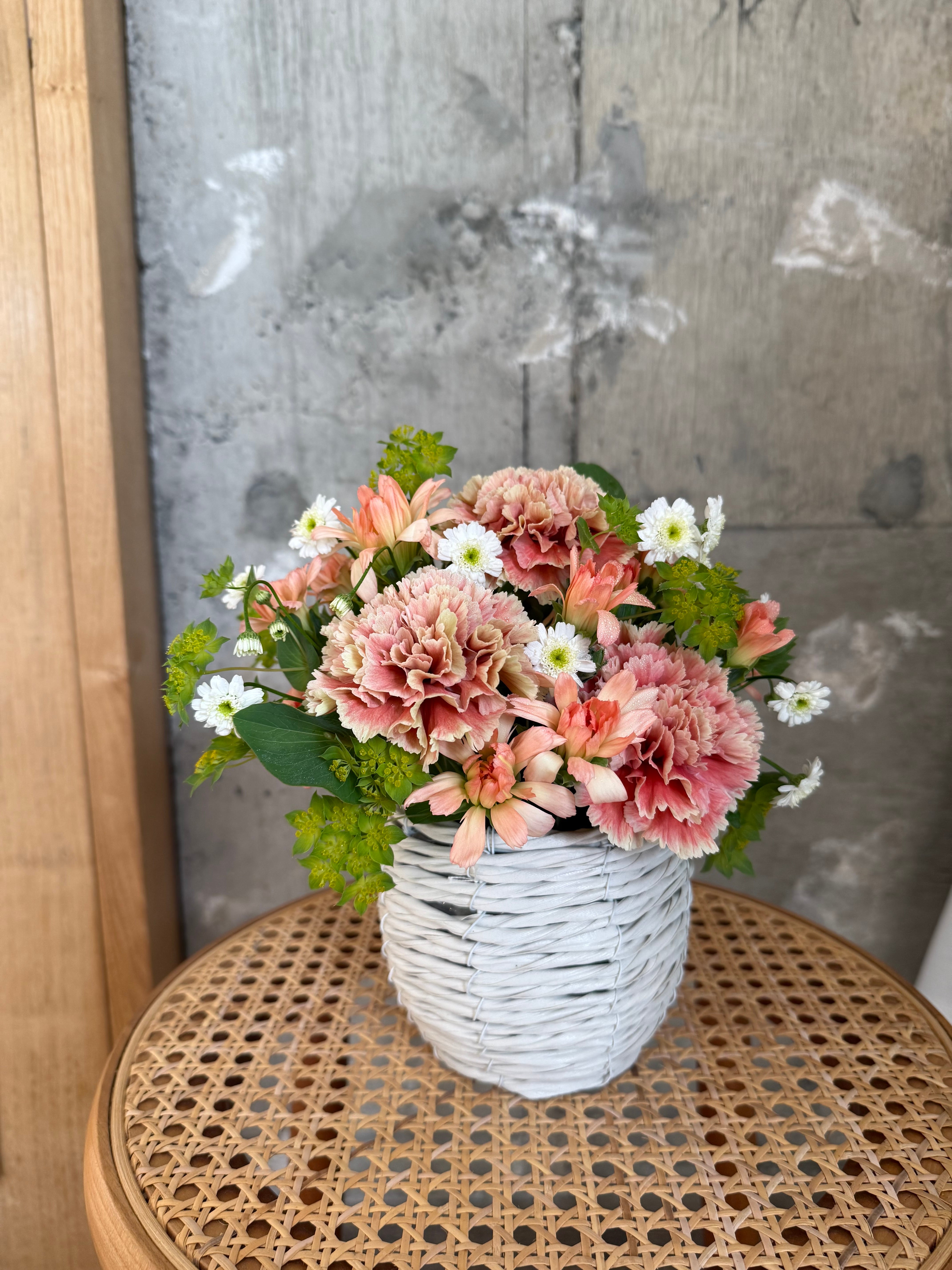 *ころんとした可愛いバスケットに、優しいピンクとアプリコットカラーのお花を詰め込んだアレンジメント。
